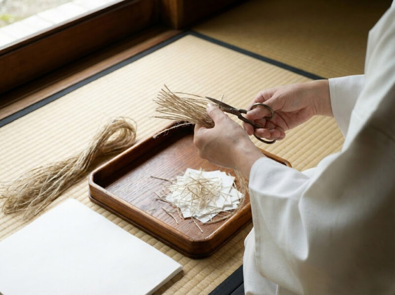 - 紙を切る 半紙を1cm〜2cm角くらいの正方形に細かく切ります。大きさは揃っていなくても大丈夫。無心でチョキチョキする時間そのものが、心を落ち着ける瞑想になります。